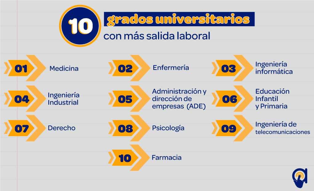 Aunque todas las titulaciones pueden abrirte puertas si sabes cómo aprovecharlas, hay algunos grados universitarios, que por la demanda actual del mercado laboral, suelen ofrecer más salidas profesionales. Alguno de ellos son: