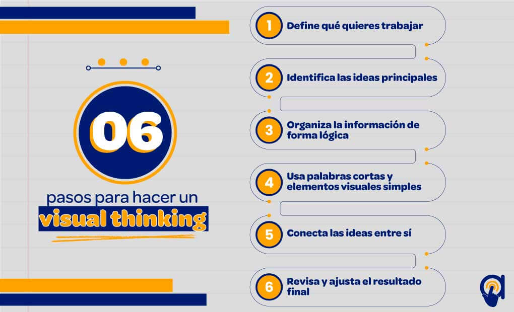 Al aplicar el visual thinking usas una forma de pensar y comunicar ideas empleando imágenes simples como dibujos, esquemas, flechas o palabras clave organizadas visualmente.